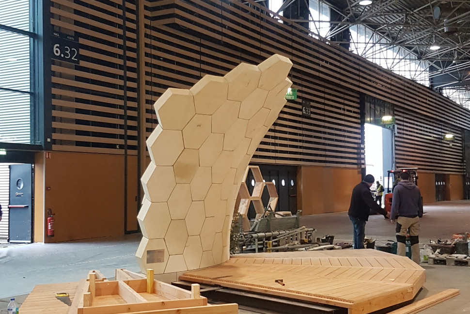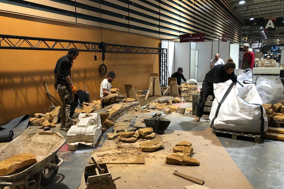Pendant ce temps, Les Compagnons du Devoir se sont attelés au montage d'une pièce en pierre naturelle : l'Acoustic Shell. Véritable œuvre de stéréotomie, ce projet était exposé sur le Forum Rocalia pour accueillir les différents conférences.