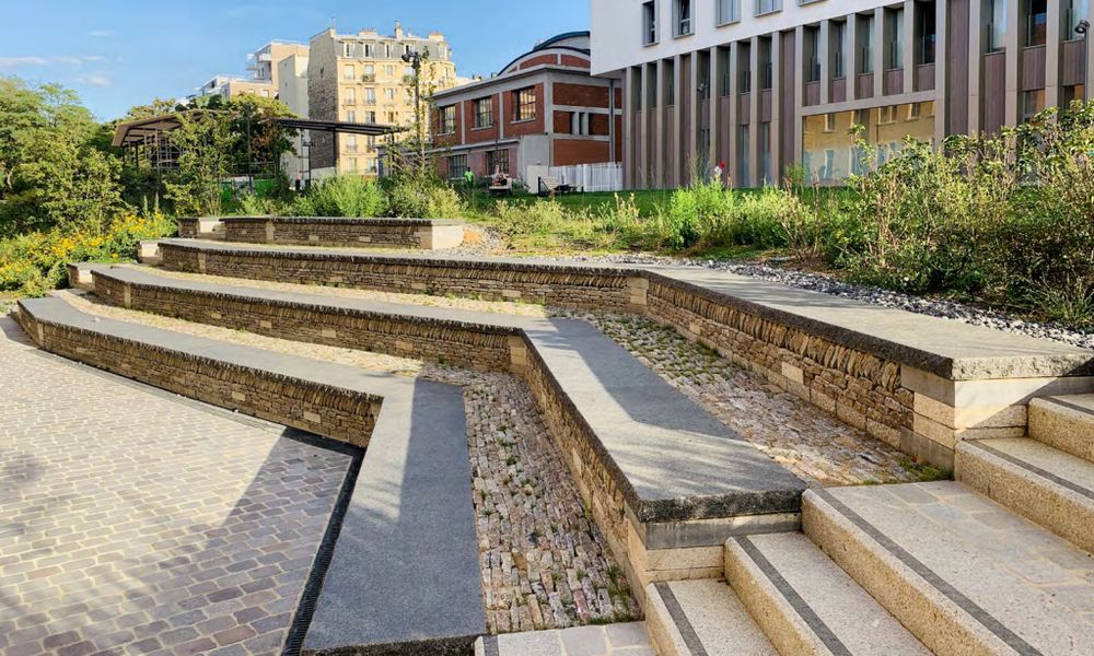 Constatant la diversité des débris de chantiers de voiries de la Ville de Paris, l'Atelier Nous a imaginé une œuvre à base de pierre naturelle recyclée, véritable alliée dans la construction de ces aménagements écologiques. Des murets-bancs, un amphithéâtre de plein air et des escaliers en pierre de taille ont donné une seconde vie aux coproduits. Chaque espace profite de sa propre pierre : granits de diverses couleurs, grès, porphyres, basaltes...