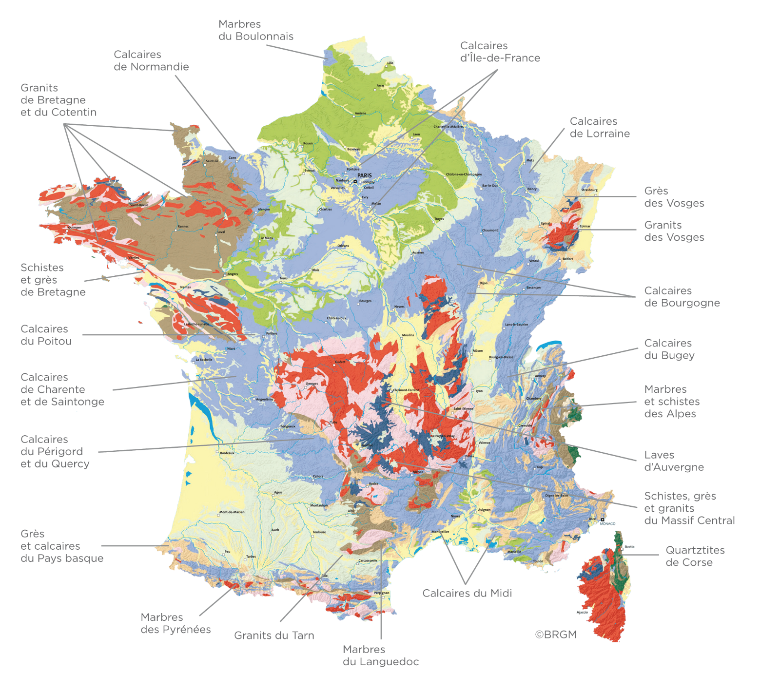 Carte de la répartition des pierres naturelles en France