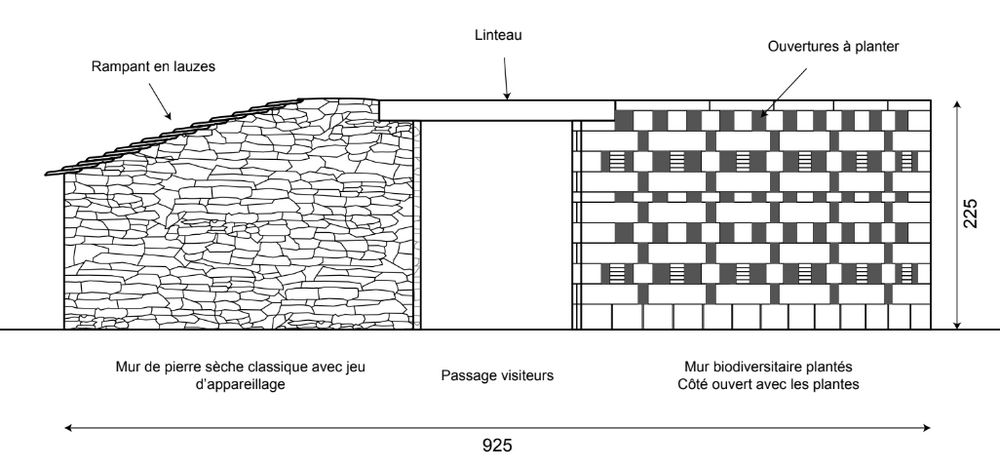 Le premier prototype de ce mur végétalisé a été construit en 2021 selon les principes de la construction en pierre sèche par Joël Jannet et Martin Muriot, membres de la FFPPS. Ils se sont basés sur la thèse doctorale de Delphine Lewandowski (agence d’architecture ChartierDalix) qui a travaillé sur les parois biodiversitaires et a imaginé et peaufiné ce nouveau concept.