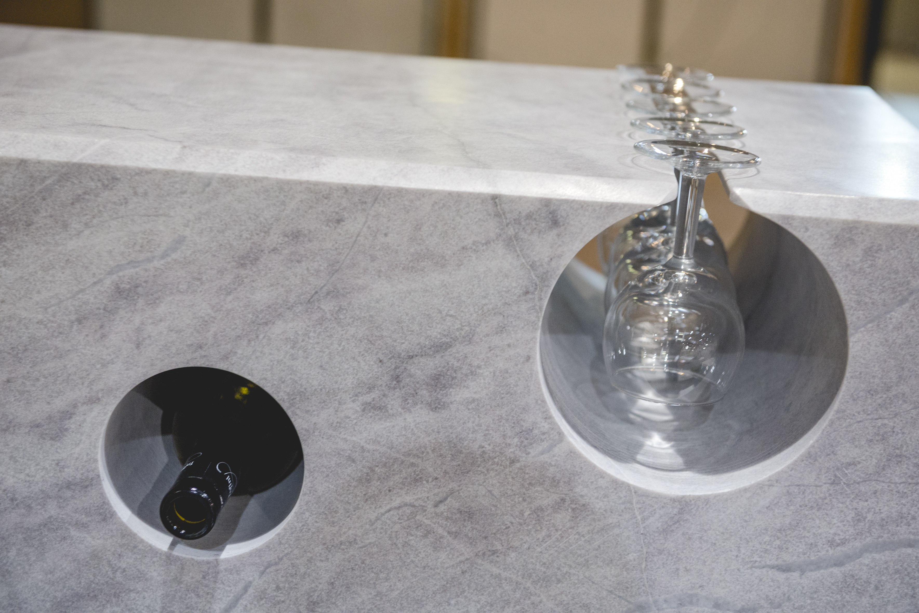 Elisabeth Polzella, architecte et membre de l’association Rhônapi, partenaire du salon, a conçu le Club Rocalia. L’idée était que chacune des pièces devait être unique, par la forme mais également par la fonction pour représenter la diversité des variétés de pierre naturelle en France.