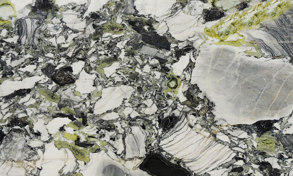 C'est dans les profondeurs du Yunnan, proche du Tibet, qu'est extraite cette atypique roche multicolore verte, blanche, grise et noire. Utilisée pour les sols et revêtements, elle est aussi appréciée des décorateurs pour son aspect visuel saisissant, s'invitant dans les salles de bain, escaliers et plans de travail de cuisine. Sa dimension chic l'amène jusque dans le secteur de la mode, la marque Sandro l'ayant utilisée pour les comptoirs et murs de ses magasins.