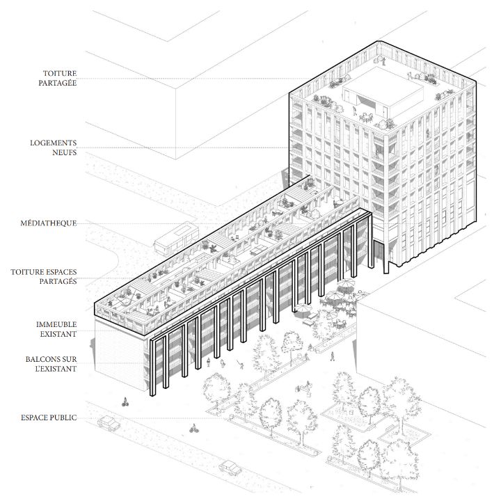 Le projet permet également de recréer une vie sociale par la transformation de commerces, la création d'une médiathèque et la réhabilitation de la toiture en espace partagé.